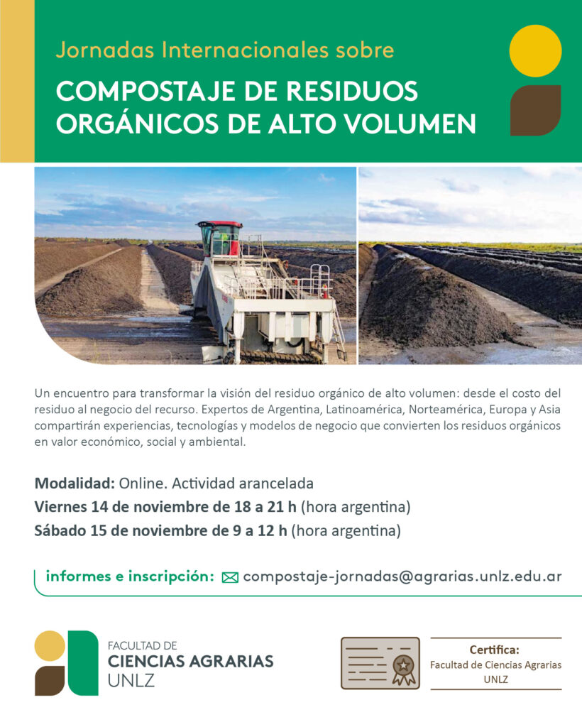 En noviembre tendrán lugar las Jornadas Internacionales de Compostaje de Residuos Orgánicos de Alto Volumen. Claves para convertir toneladas de residuos agroindustriales y/o domiciliarios en productos de valor agregado para uso agronómico.